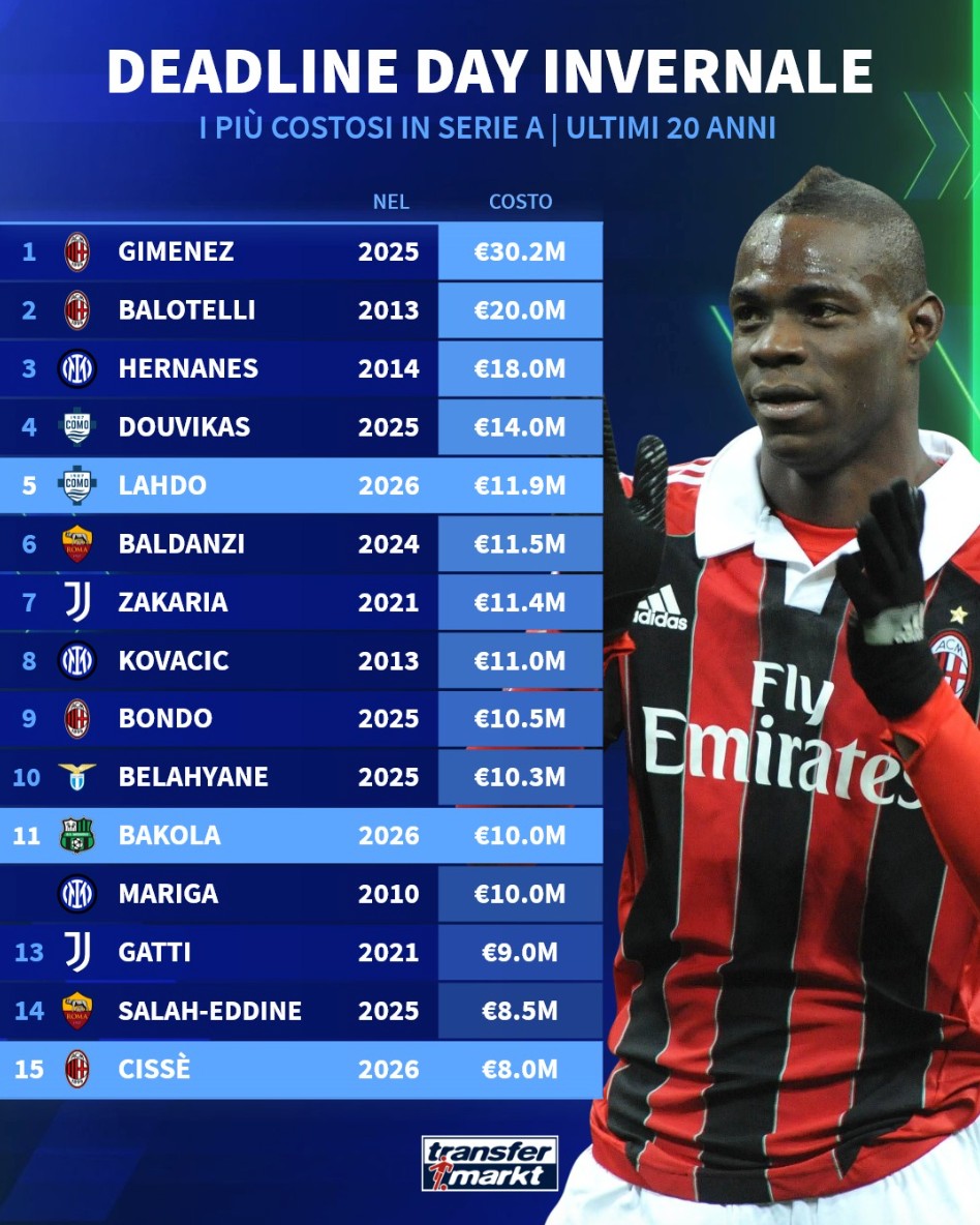 北京时间2月3日,德转统计出了2006年以来意甲冬窗截止日最贵的15笔交易,AC米兰2025年冬窗3020万欧元引进圣地亚哥-希门尼斯排名第一,2013年AC米兰2000万欧元引进巴洛特利排名第二,国际米兰2014年1800万欧元引进埃尔纳内斯第三。德转列2006年至今意甲冬窗截止日最贵15笔交易:1.圣地亚哥-希门尼斯(AC米兰)2025年3020万欧元2.巴洛特利(AC米兰)2013年2000